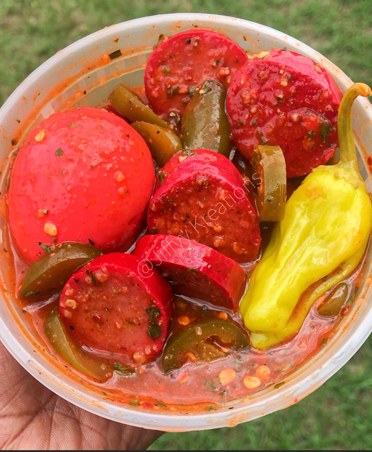 Pickled Sausages; (2)Homemade Pickled Egg; Pickles; Jalapeños Peppers & Jiffyy’s Spicy Sauce.
